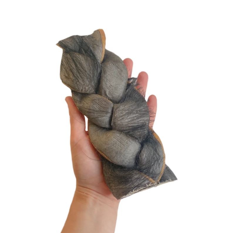 A Pele de Búfalo LUV é um mastigável natural feito de pele de búfalo desidratada, incluindo pelos, cortada em tiras trançadas de aproximadamente 20 cm. Esse formato dificulta o início da mastigação, tornando a brincadeira mais envolvente e prolongada para o seu cão.